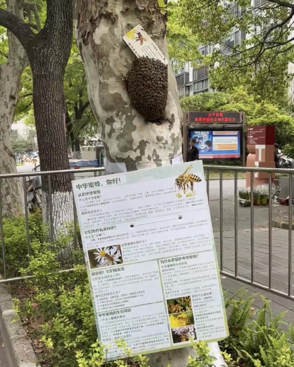 当天下午,后勤工作人员就在树干上贴了两张“请勿靠近”的提醒,同时拉起了安全线。郭光普则多了一项日常:每隔一段时间,从办公室步行五分钟到这棵悬铃木旁,看看这群蜜蜂的状态,也看看学生们是否被困扰。