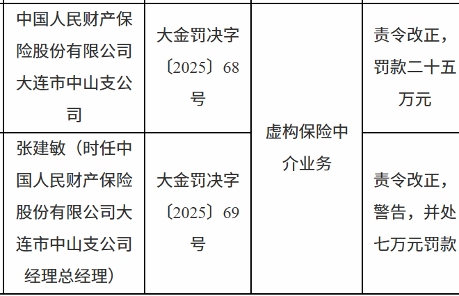 12月19日,国家金融监督管理总局大连监管局行政处罚信息公开表显示,中国人民财产保险股份有限公司大连市中山支公司因虚构保险中介业务被罚款二十五万元;张某敏被警告并处七万元罚款。