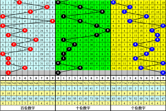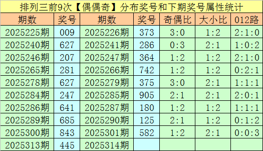在最近9期开出奇偶分布:偶偶奇的奖号为:009-627-207-281-627-247-641-685-843,在下期出现号码分别为:373-286-364-742-375-905-180-125-582。其中百十个位号码分布情况如下: