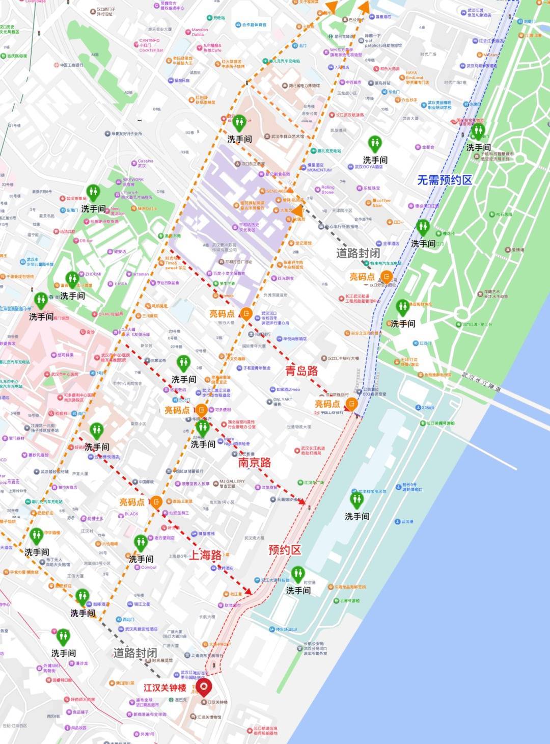 (三)活动当天,须携带电子预约凭证,按所预约时段有序入场。请在“亮码点”主动出示电子预约凭证,“亮码点”位于洞庭街与上海路、南京路、青岛路的交汇路口,青岛路、天津路与沿江大道交汇的水马拦截区入口(交通提示图上均已标注)。